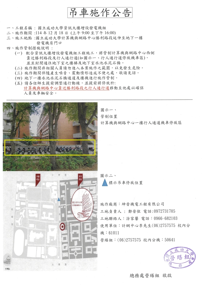 有關「資訊大樓增設發電機組」吊運發電機設備作業施工公告及施工作業期間制區域範圍車輛路線公告