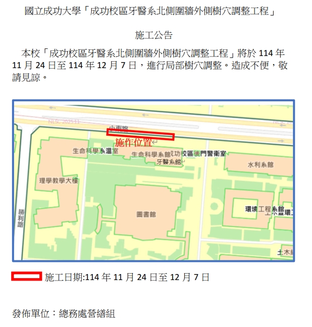 施工公告:「成功校區牙醫系北側圍牆外側樹穴調整工程」